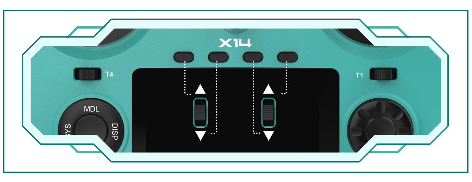 Il TWIN X14S offre 4 pulsanti personalizzabili, posizionati con cura al centro del pannello radio per operazioni frequenti e in tempo reale. Prendiamo, ad esempio, quando si vola su un aliante RC, per configurare questi pulsanti come funzioni Trim aggiuntive di ETHOS, questi pulsanti diventano preziosi per le regolazioni al volo, consentendo ai piloti di adattare l'angolo dei flap/superficie in base alla situazione reale. -tempo dell'aria ambiente.