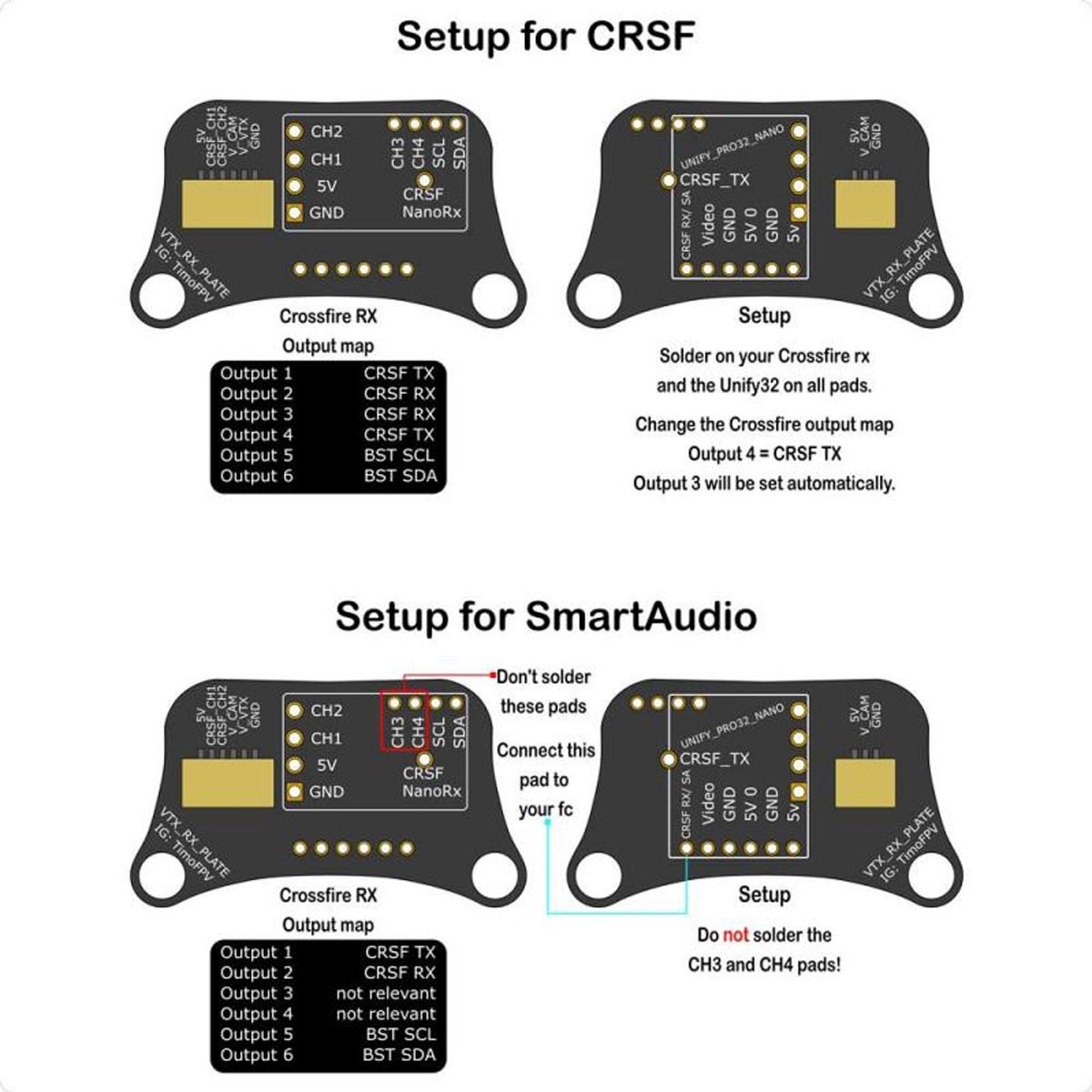 * CRSF TX / RX tra VTX e RX sono cablati internamente se si collegano tutti i pin.