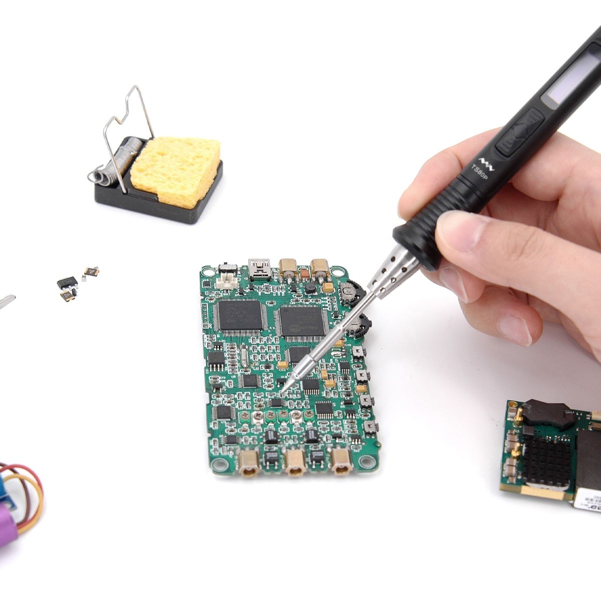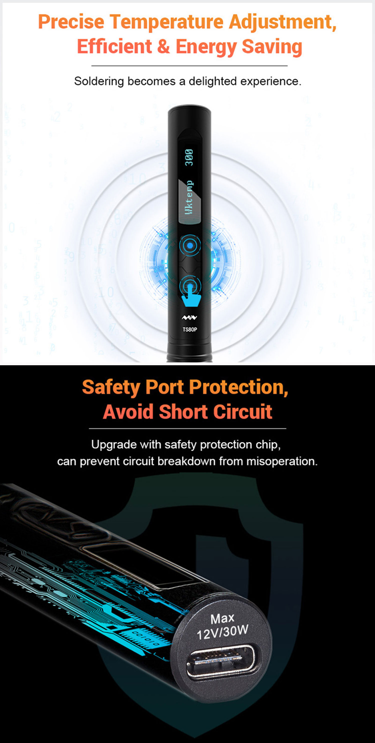 Con un chip STM32 integrato, TS80P può controllare in modo intelligente l'aumento e la diminuzione della temperatura della punta e dispone di sospensione, spegnimento automatico, protezione di sicurezza e altre modalità.