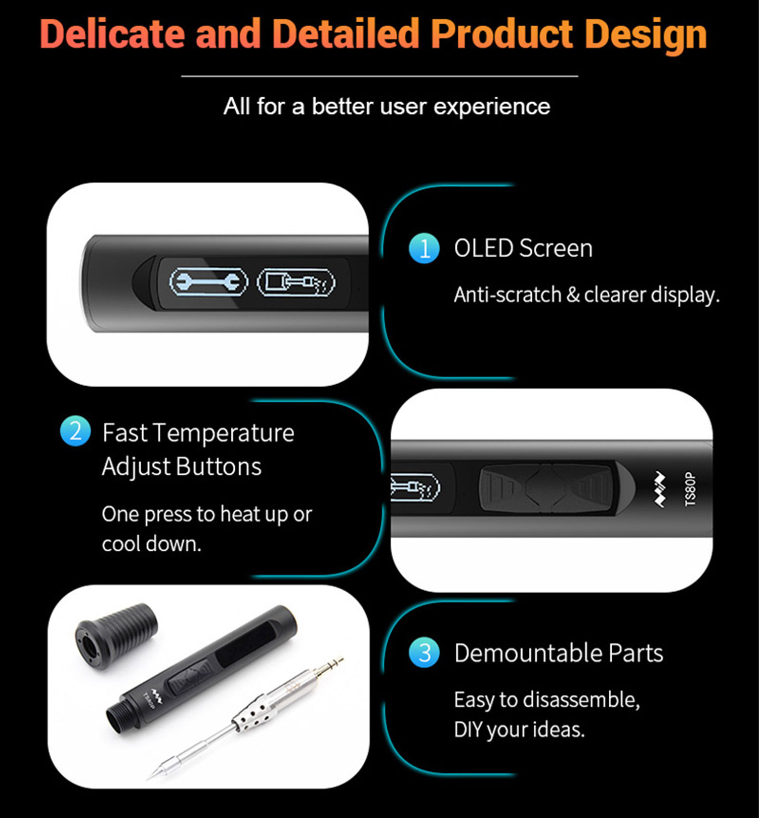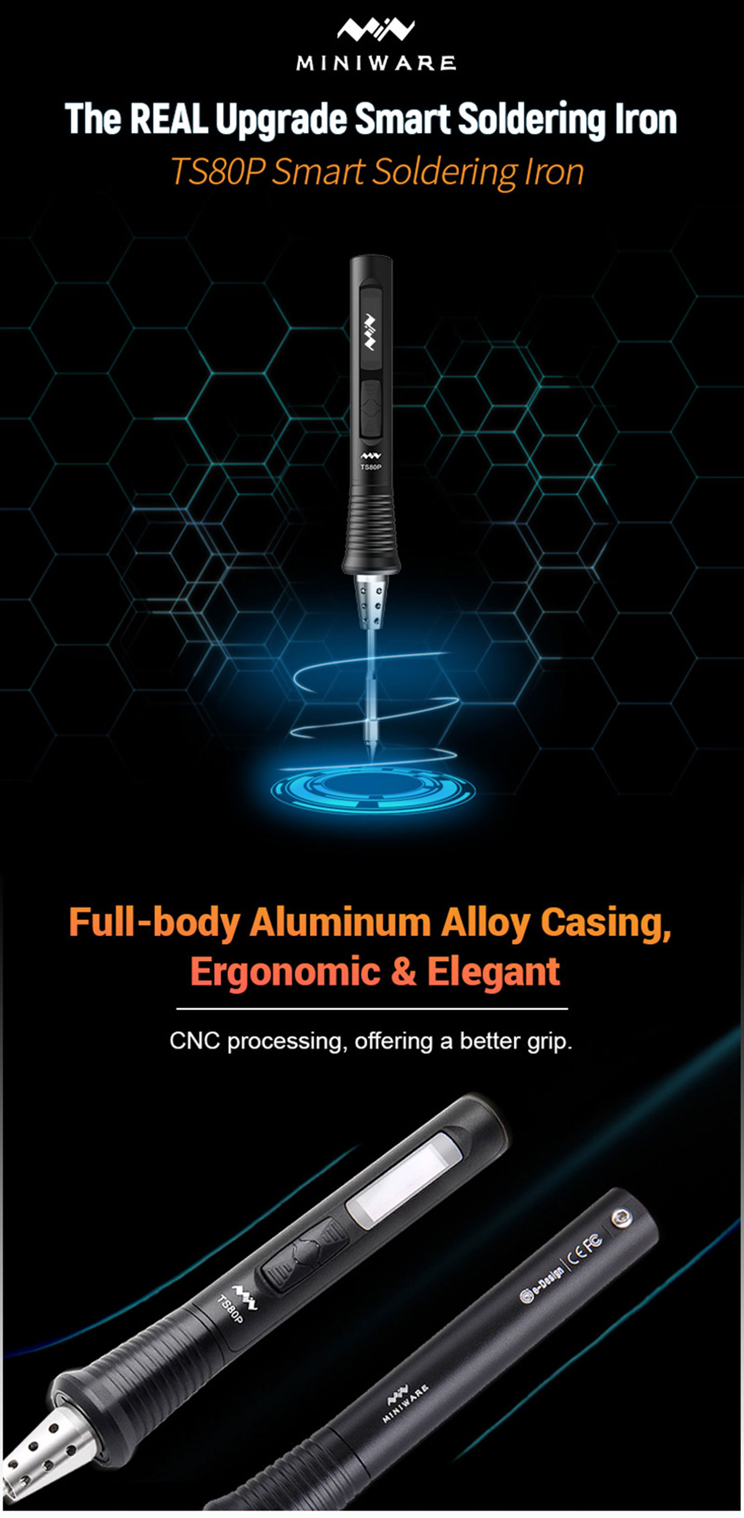 Inoltre è dotato di uno schermo OLED, in modo da poter monitorare lo stato del saldatore in qualsiasi momento è anche dotato di un nuovissimo dispositivo di fissaggio della punta facile da spingere, che offre una migliore esperienza di tenuta e una facile spinta per allentare la punta di saldatura per una rapida sostituzione.